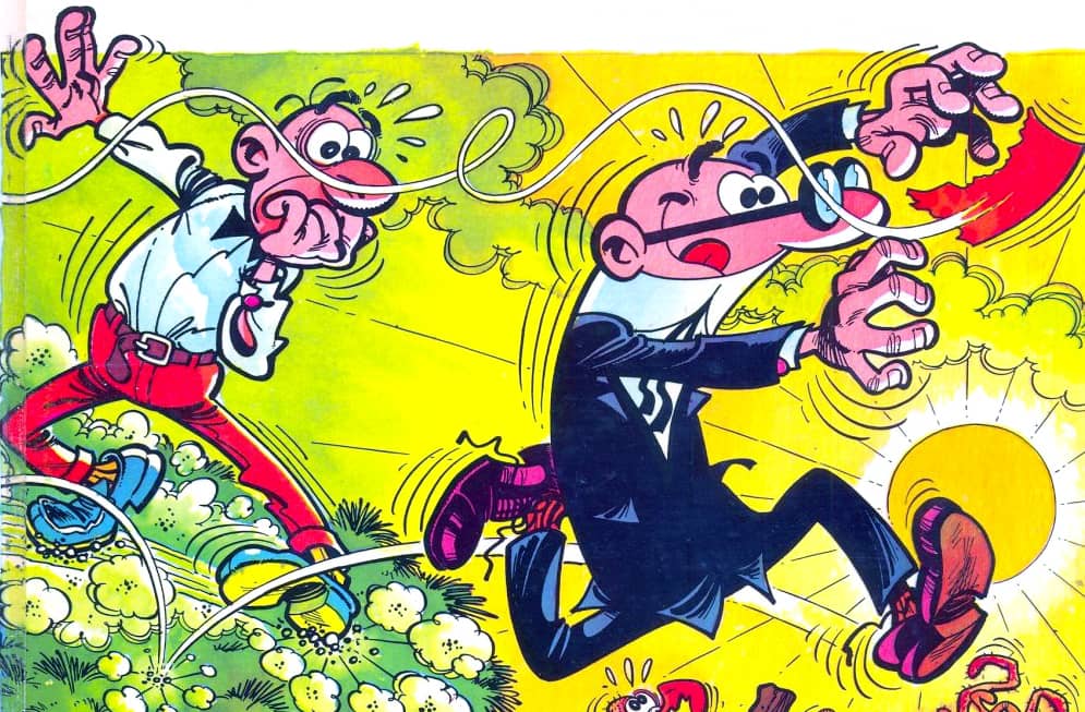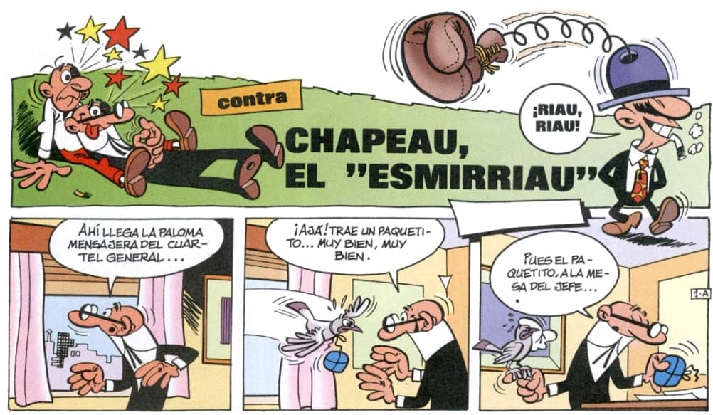 De nou, per tant, l’humor. L’humor sempre present. Un exercici de comicitat permanent amb el propòsit de fer riure els lectors com més vegades millor. Fixem-nos-hi bé: tot en Ibáñez és un mecanisme per encabir-hi l’humor. Primer element, la trama. La trama de les historietes és mínima, perquè no és el més important, és sobretot una estructura que ha de permetre encadenar els gags. La paraula gag, que ja ha sortit abans en aquest text, és essencial en Ibáñez. La feia servir constantment (reviseu els centenars d’entrevistes) i remet als gags del cinema còmic mut que tant li agradava. El cinema de Laurel i Hardy, del primer Charlot, de Harold Lloyd, dels germans Marx. Allà tampoc importava gaire la trama però sí els gags, que s’encadenaven sense descans. Recordeu com es movien els personatges d’aquestes velles pel·lícules? Mireu ara com es mouen els personatges d’Ibáñez en les vinyetes de les seves pàgines. Mireu els dibuixos sense llegir els diàlegs. Veureu que és el moviment d’aquest vell cinema traslladat al paper. I això té un mèrit immens, i val la pena destacar-ho, perquè Ibáñez aconsegueix donar sensació de moviment en un mitjà, el còmic, fet a base d’imatges fixes. En el cinema les imatges estan en moviment; en el còmic les imatges són estàtiques però gràcies a l’habilitat d’Ibáñez el moviment es reconstrueix al cap del lector. No és màgia, és talent.
