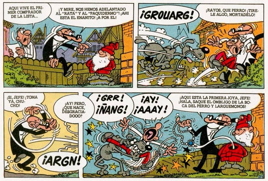 A més, en el cas del còmic, la narració (o si volem dir-ho de manera planera: fer-se entendre) és un exercici que actua a diferents nivells. Ibáñez sap composar la imatge de manera brillant, tant si és una portada com si és una vinyeta, i sap també encadenar perfectament les vinyetes perquè formin una narració coherent i fàcil d’entendre (recordeu l’exercici del dinamisme dels personatges que dèiem abans?). Bona part de la història que ens explica Ibáñez la podem deduir gràcies a la gestualitat dels personatges, a la seva expressivitat, al bon enquadrament de cada escena, a l’equilibri de cada vinyeta que fa que la vista se’n vagi als elements que realment importen, i gràcies a la seva enorme capacitat per anar enfilant una vinyeta rere una altra fins a formar una seqüència, una escena i una història. Un còmic està format per aquestes petites peces que són les vinyetes i que només si estan ben posades una al costat de l’altra, formen un bon relat. Ibáñez no només ens va ensenyar a llegir paraules i textos, també ens va ensenyar a llegir historietes. D’alguna manera, ens va donar a molts de nosaltres, gairebé sense adonar-nos-en, les claus per llegir un còmic, del tipus que sigui. Ell ens va explicar la gramàtica de la historieta, una gramàtica que dominava plenament.